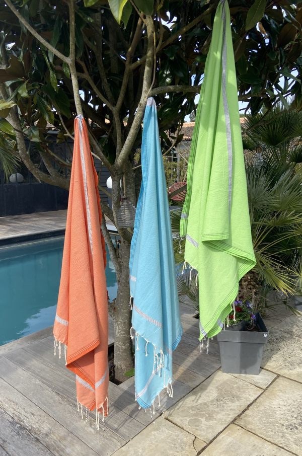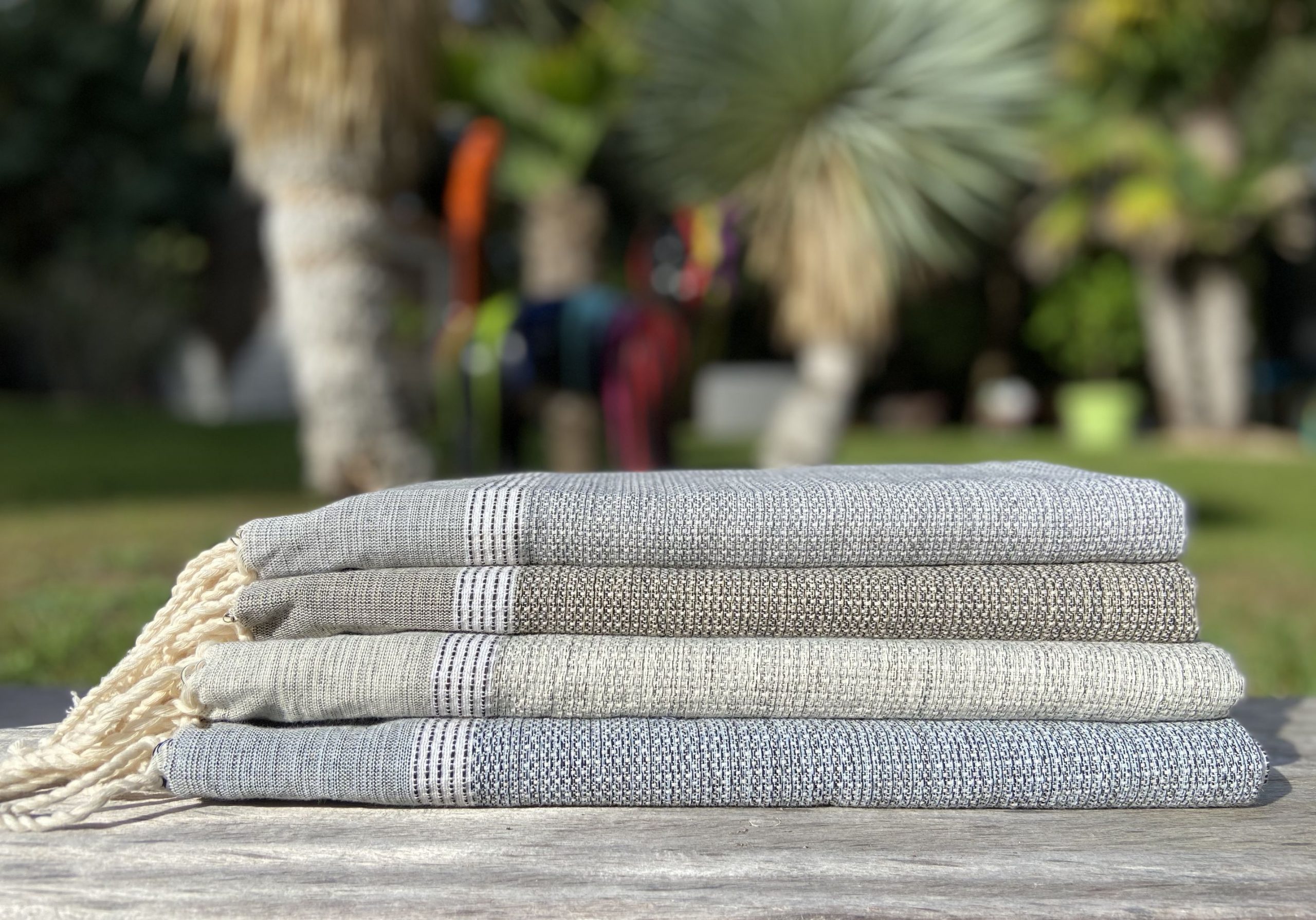 Fouta Nomade 100% coton, la serviette de bain à utiliser quotidiennement. La fibre, une fois lavée, devient extrêmement agréable et douce.